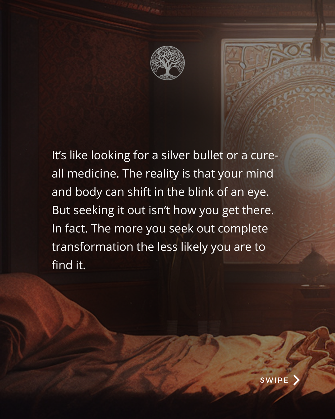 It’s like looking for a silver bullet or a cure-all medicine. The reality is that your mind and body can shift in the blink of an eye. But seeking it out isn’t how you get there. In fact. The more you seek out complete transformation the less likely you are to find it.